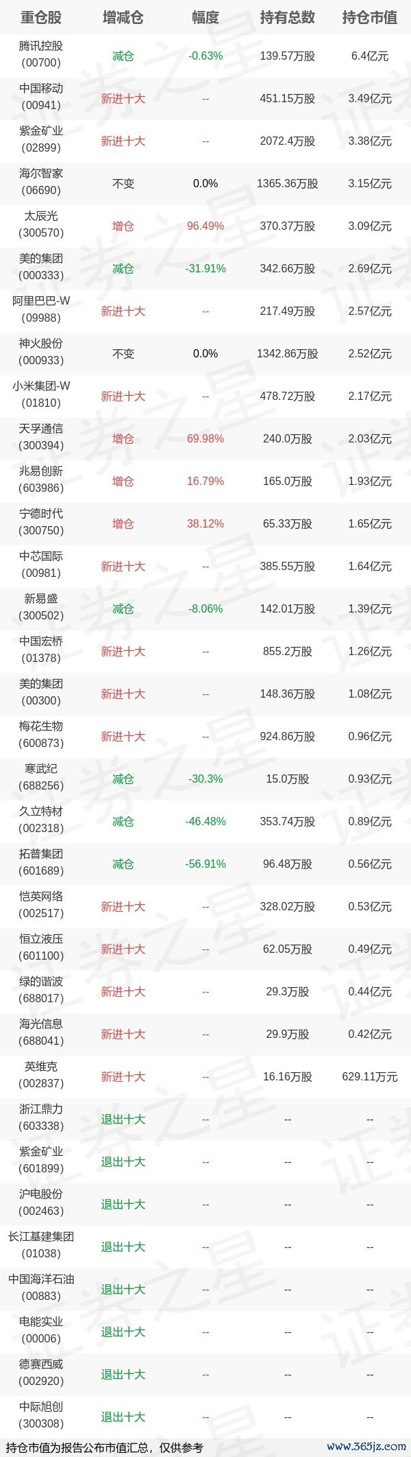 本站消息,4月22日景顺长城基金张仲维旗下基金公布2025年一季报,综合其旗下各基金报告速盈配资,港股持仓比重大幅增加,,中国移动、阿里巴巴-W、紫金矿业等新入十大重仓;另外,新能源汽车行业板块个股更受其关注,与上季度相比,宁德时代等被增持,英维克等新入十大重仓;汽车零部件行业板块则遭到减持,沪电股份,德赛西威等退出十大重仓,拓普集团等被减持;目前其旗下基金综合持仓排名前三个股为腾讯控股、中国移动、紫金矿业。