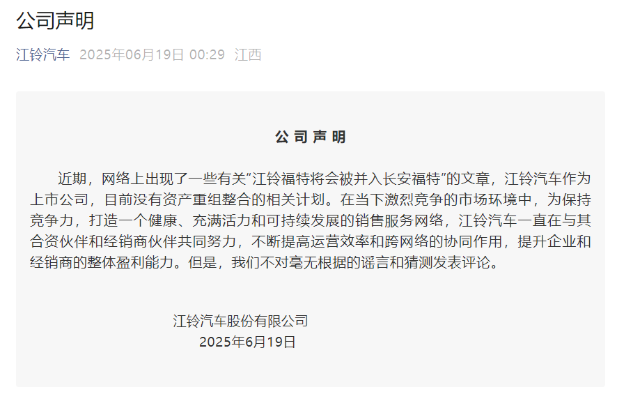 江铃福特将被并入长安福特?江铃汽车回应:目前没有资产重组整合相关计划江铃福特将被并入长安福特?江铃汽车回应:目前没有资产重组整合相关计划