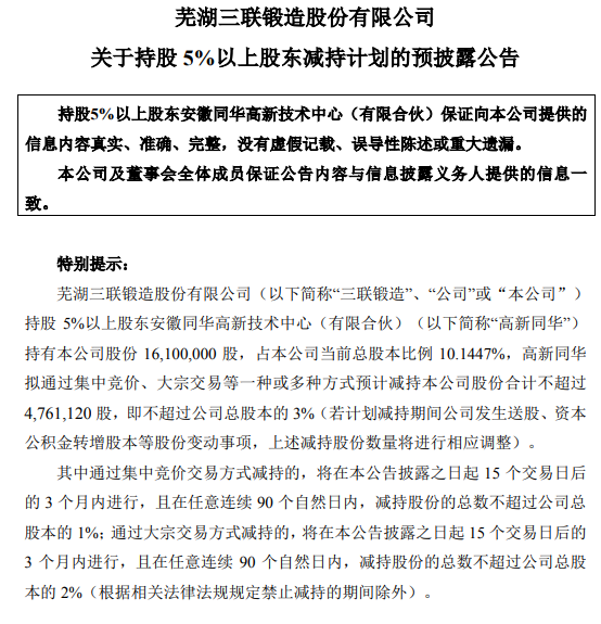 三联锻造:持股5%以上股东拟减持不超过3%公司股份嘉理证券三联锻造:持股5%以上股东拟减持不超过3%公司股份