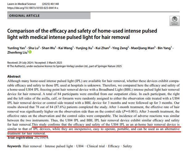 2025年5月,知名国际期刊《Lasers in Medical Science》(《激光医学杂志》)发表学术文章,论证了Ulike家用蓝宝石冰点脱毛仪的安全性和有效性。该论文由南方医科大学皮肤病医院和中山大学孙逸仙纪念医院联合发表,并收录进SCI(Science Citation Index)。至此,Ulike成为行业首个且唯一经SCI+公立三甲医院临床报告验证有效的脱毛仪品牌易策略,不仅为光学美肤领域树立起全新的品质标杆,也为有脱毛需求的用户提供了科学可靠的脱毛新选择。
